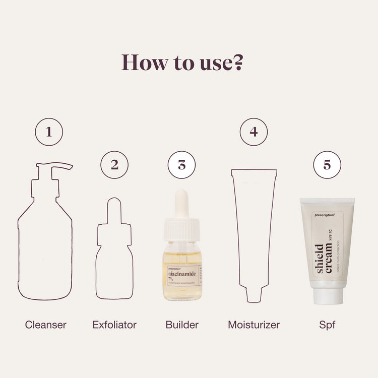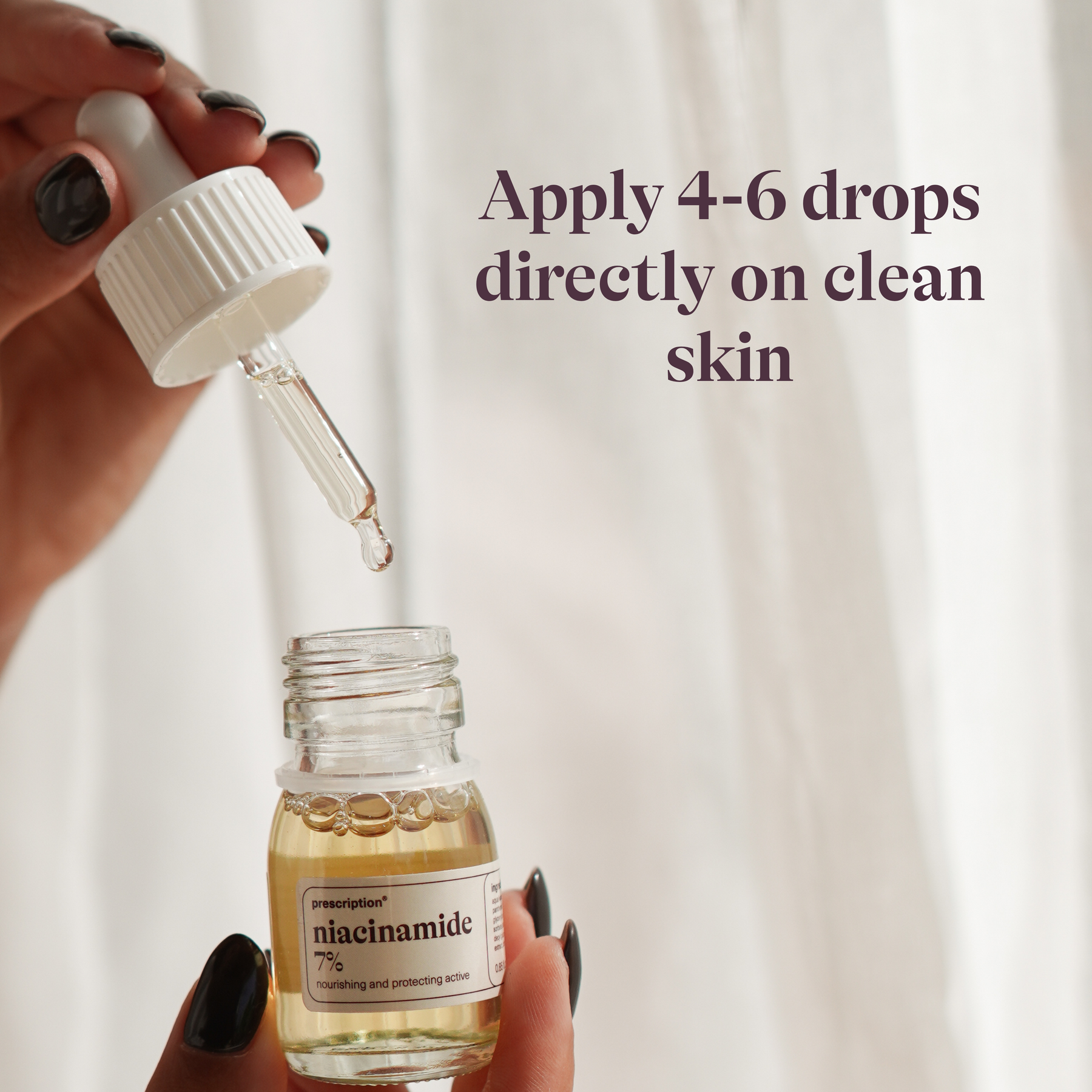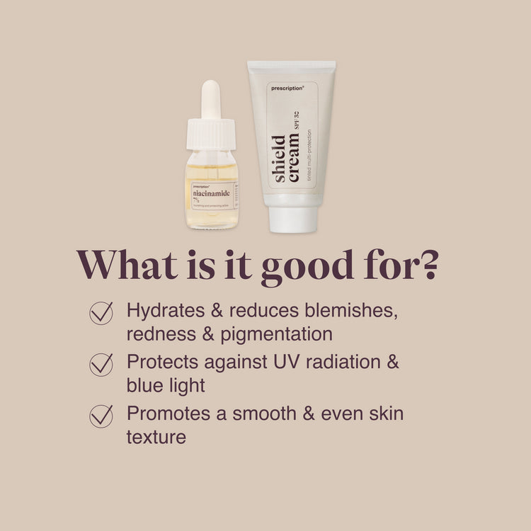Simpel, breng voor de ultieme bescherming 3 druppels van de Niacinamide aan gevolgd door shield cream SPF30.