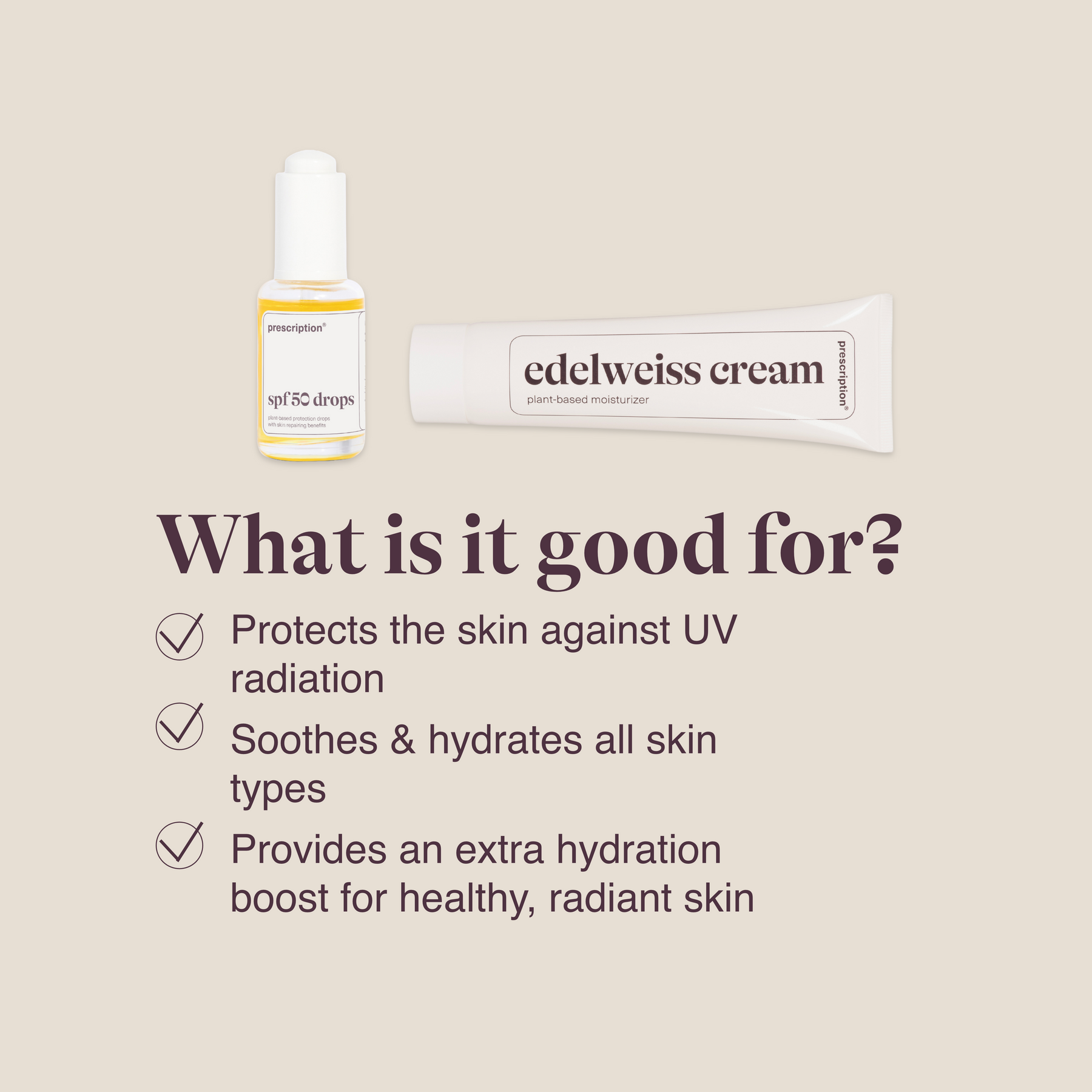 Het perfecte duo voor de warme zonnige dagen! De SPF50 drops beschermen jouw huid tegen UV-straling en voorkomt vroegtijdige huidveroudering. Combineer hem met de Edelweiss cream, een plant-based moisturizer, en jouw huid krijgt een extra hydratatieboost!